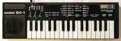 The Casio SK-1 is a small sampling keyboard made by Casio in 1985.[1][2] It has 32 small sized piano keys, four-note polyphony, with a sampling bit depth of 8 bit PCM and a sample rate of 9.38 kHz for 1.4 seconds, a built-in microphone and line level and microphone inputs for sampling, and an internal speaker and line out. It also features a small number of four-note polyphonic preset analog and digital instrument voices, and a simple additive voice.