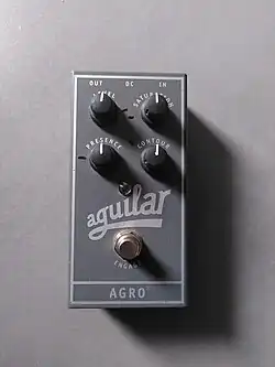 Some bass amplifiers have an "overdrive" or distortion effect built into the unit. The Peavey Century 200 has an onboard "distortion" effect on the second channel. The Peavey VB-2 also has built-in overdrive. Aguilar Amplification's AG 500 bass head is a two-channel amplifier, one of which offers a "saturation" control for overdrive. A variety of BOSS combo amplifiers have a built-in "drive" effect. Gallien-Krueger's bass amp heads have a "boost" control that provides a simulated tube overdrive effect. The Behringer Ultrabass BVT5500H Bass Amplifier Head has a built-in limiter and overdrive. The LowDown LD 150 bass amp has a range of overdrive sounds, from a slight hint to heavy distortion. The CUBE-20XL BASS amp includes built-in overdrive.