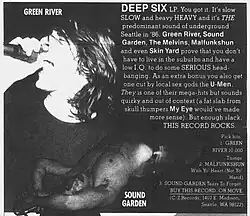 The early grunge movement revolved around Seattle's independent record label Sub Pop and the region's underground music scene, with local bands such as Green River, the Melvins, and Mudhoney playing key roles in the genre's development. Sub Pop marketed the style shrewdly, encouraging media outlets to describe the Seattle sound as "grunge"; the style became known as a hybrid of punk and metal.[8] By the early 1990s, its popularity had spread, with similar sounding bands appearing in California, then emerging in other parts of the United States and Australia, building strong followings and signing major record deals. Grunge broke through into the mainstream in the early-to-mid-1990s, led by Nirvana's Nevermind in 1991, and followed by other crossover successes including Pearl Jam's Ten, Soundgarden's Badmotorfinger, and Alice in Chains' Dirt. The success of these bands boosted the popularity of alternative rock, eventually making grunge the most popular form of hard rock music during the 1990s.[5]