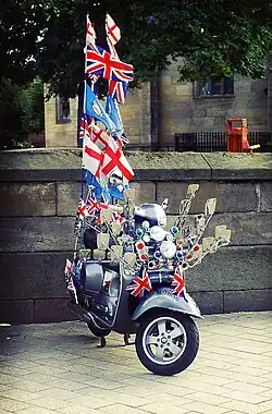 After the seaside resort brawls, the media began to associate Italian scooters with violent mods. Much later, writers described groups of mods riding scooters together as a "menacing symbol of group solidarity" that was "converted into a weapon".[76][77] With events like the 6 November 1966, "scooter charge" on Buckingham Palace, the scooter, along with the mods' short hair and suits, began to be seen as a symbol of subversion.[78]