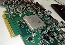 In November 2018, Xilinx migrated its defense-grade XQ UltraScale+ products to TSMC's 16 nm FinFET process.[49][50][51] The products included the industry's first defense-grade heterogeneous multi-processor SoC devices and encompassed the XQ Zynq UltraScale+ MPSoCs and RFSoCs as well as XQ UltraScale+ Kintex and Virtex FPGAs.[52][53] That same month the company expanded its Alveo data center accelerator cards portfolio with the Alveo U280.[54] The initial Alveo line included the U200 and U250, which featured 16 nm UltraScale+ Virtex FPGAs and DDR4 SDRAM.[55] Those two cards were launched in October 2018 at the Xilinx Developer Forum.[56] At the Forum, Victor Peng, CEO of semiconductor design at Xilinx, and AMD CTO Mark Papermaster, used eight Alveo U250 cards and two AMD Epyc 7551 server CPUs to set a new world record for inference throughput at 30,000 images per second.[56]